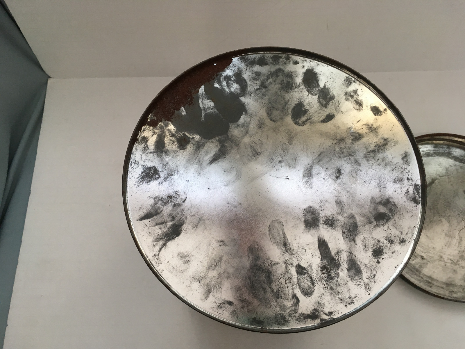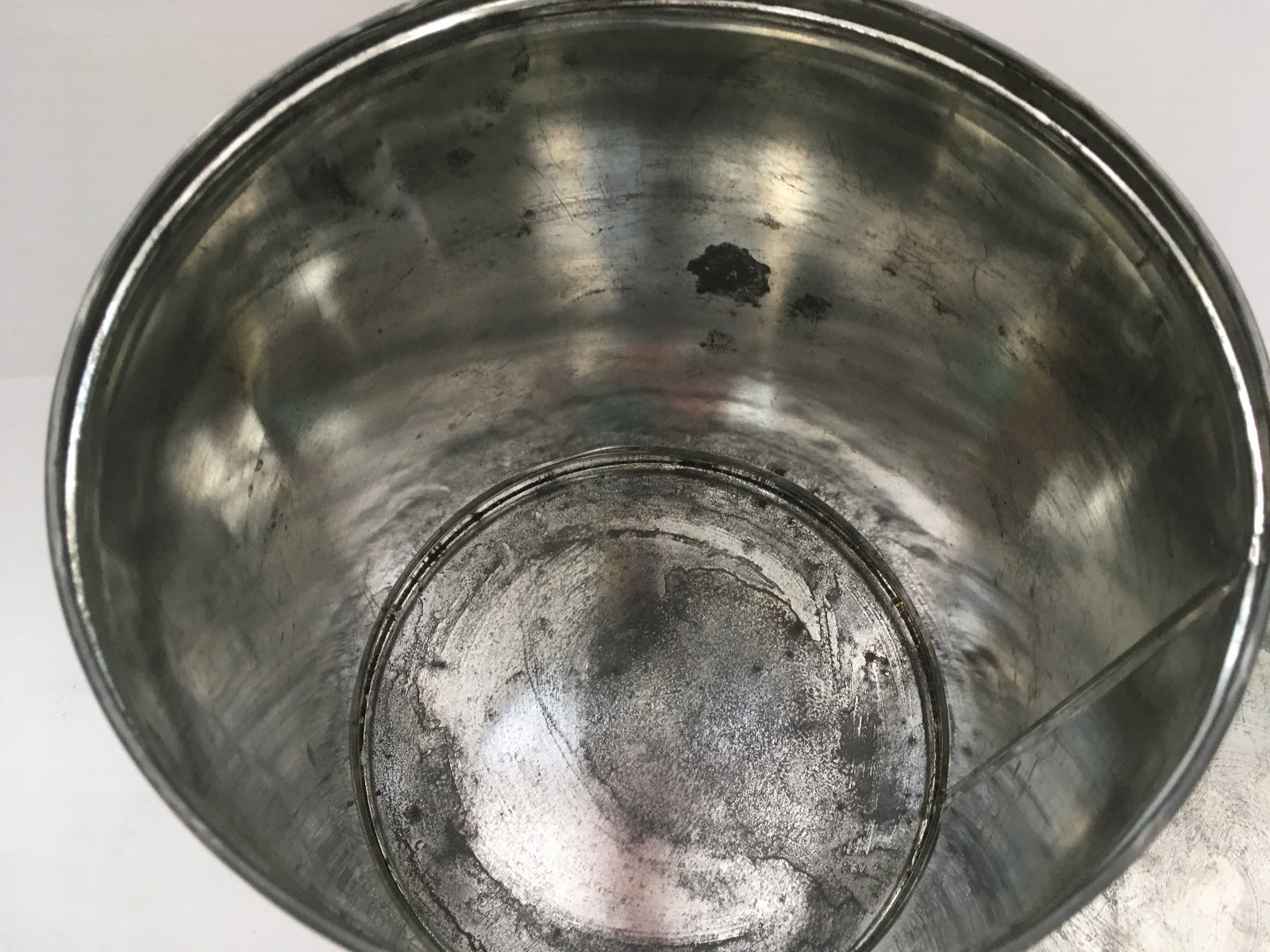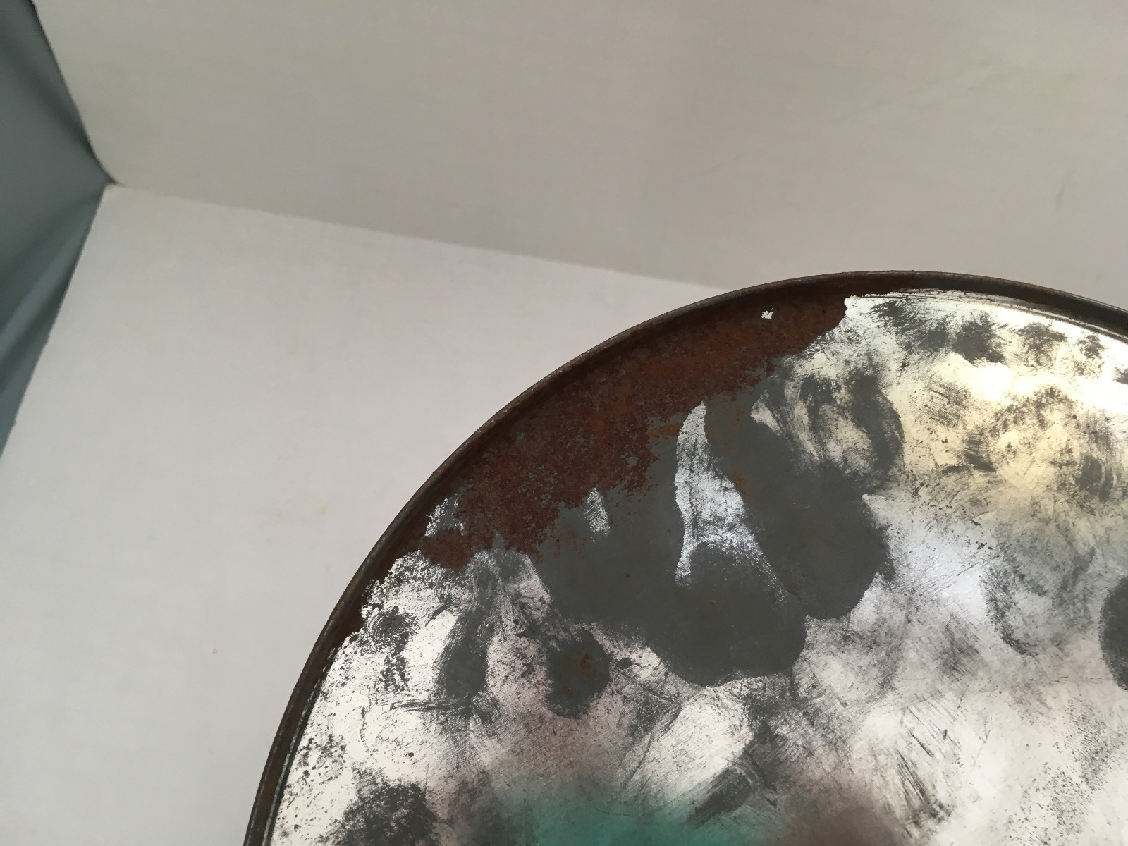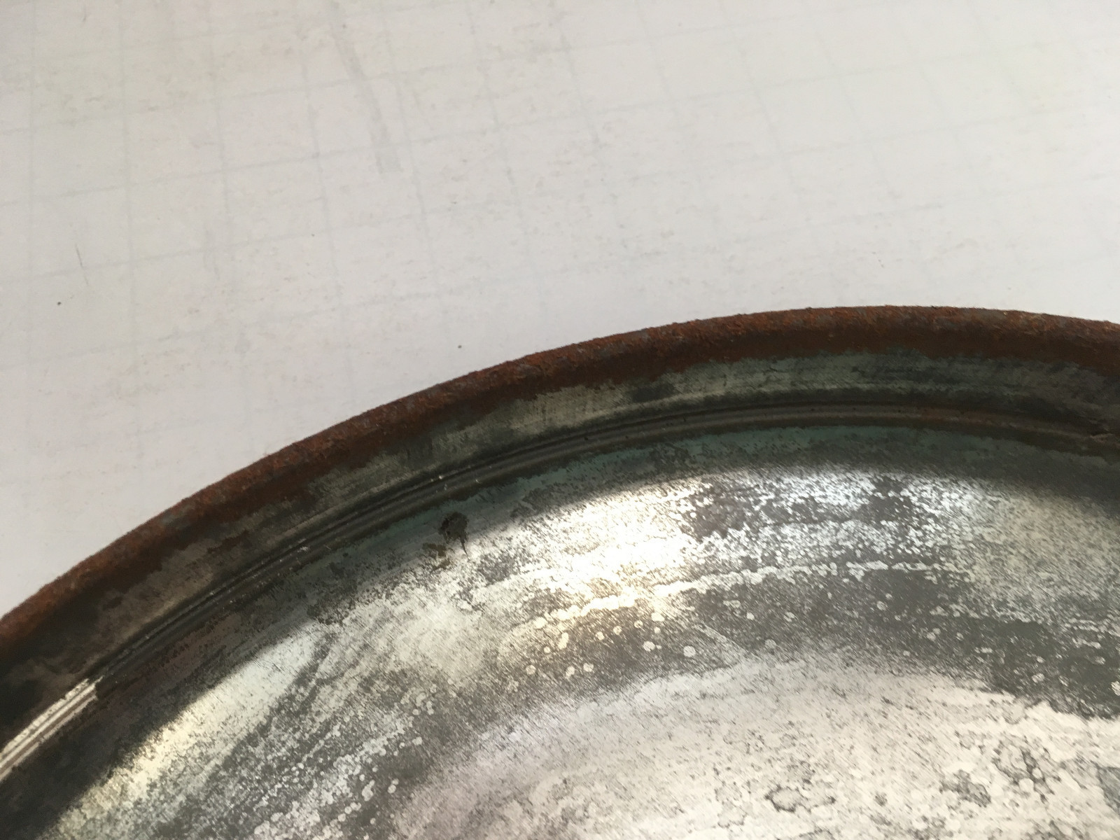 pre owned used condition with wear and aging rust on bottom and along the lid rim area which makes the lid hard to remove
