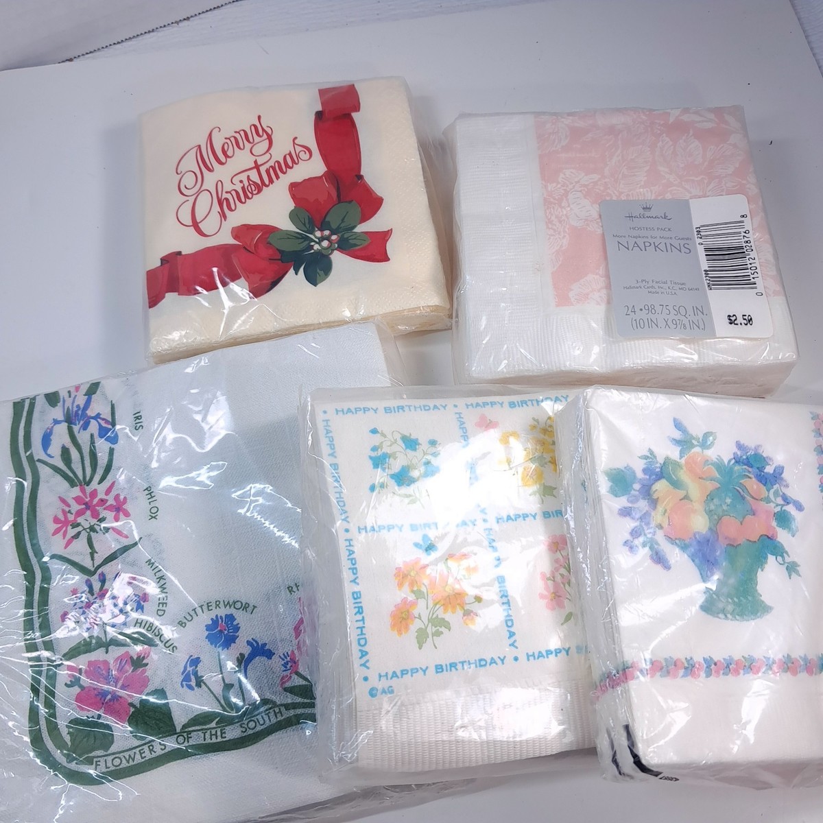 Includes 5 packs of napkins. Most are cocktail napkins, but one pack is dinner/regular sized. All are new packs. Includes: