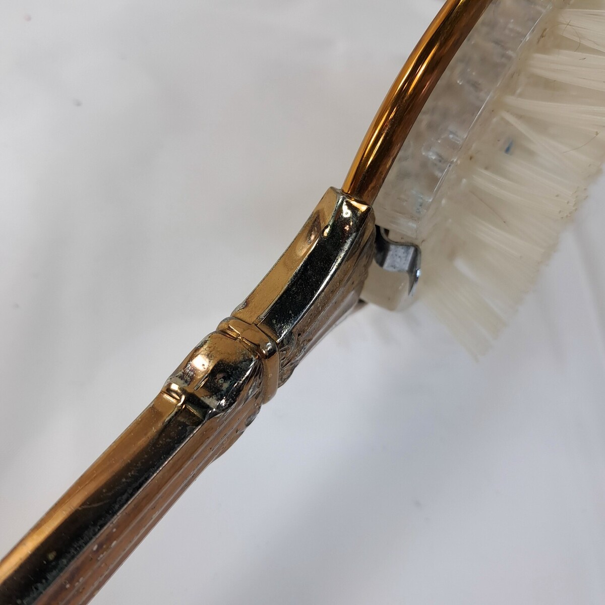 Gold tone brush with clear bristles. Patina/wear/marks/scratches as shown.