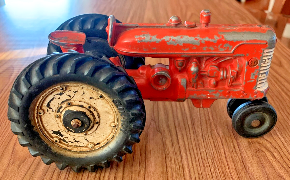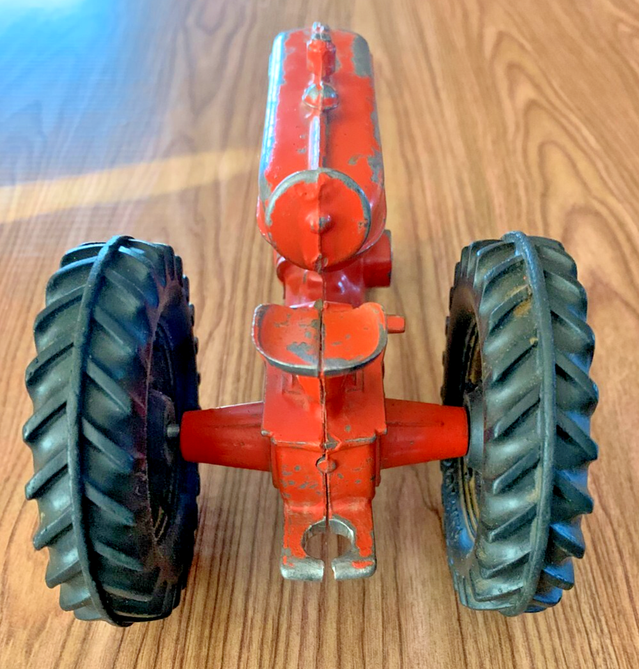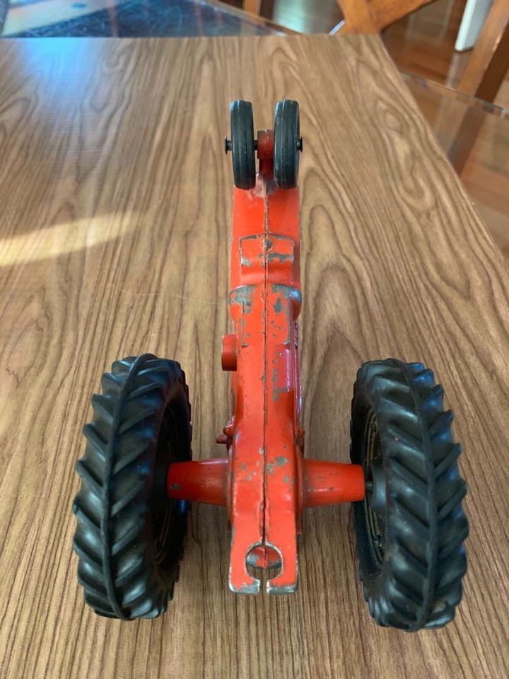 Pre-owned toy tractor has served it original purpose, patina on body paint, tires good, great collectible or restore project.