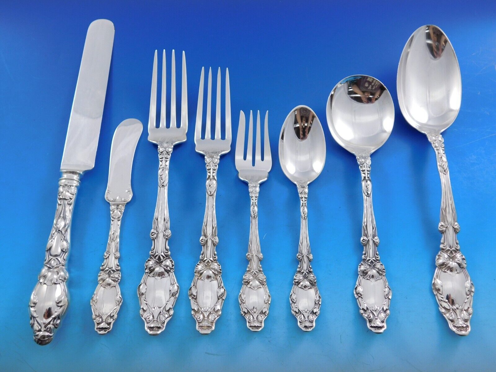 Stunning Virginiana by Gorham sterling silver Art Nouveau Flatware set, 48 pieces. This set includes: