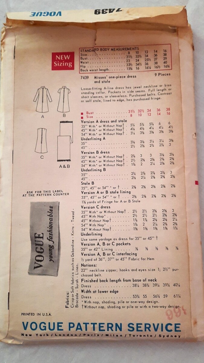 - VOGUE PATTERN 7439 Easy to Make 1 Pc DRESS & STOLE Vtg 60s Sz 12 UNCUT