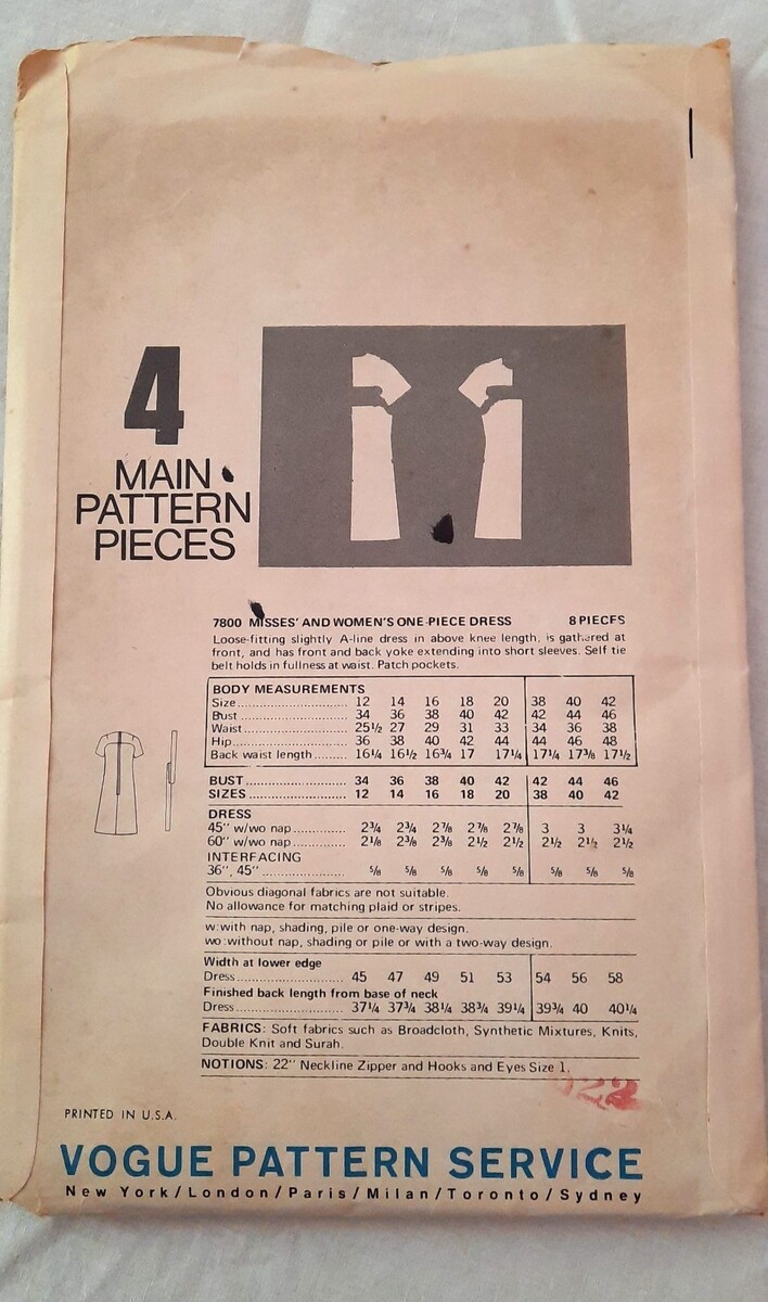 - VOGUE PATTERN 7800 Vtg 70s DRESS Sz 12 Very Easy Very Vogue
