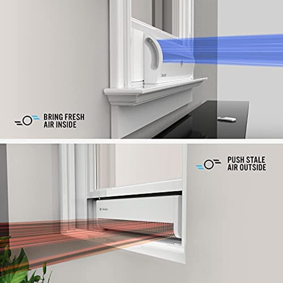 Transom is the result of a complete re-imagining of what a window fan should be. The air chamber abundantly draws fresh air from the outside in ? or reverses electronically to exhaust stale air out. Powerful airflow circulation and comfort at half the height of conventional window fans, Transom is easy to install, blends elegantly into the space and preservesyour view. Transom seals off windows 26? to 40? wide with the patented Soft-fit System that provides a sleek, satisfying and snug fit from end to end, without having to remove your screen. Transom ? a new kind of window fan.