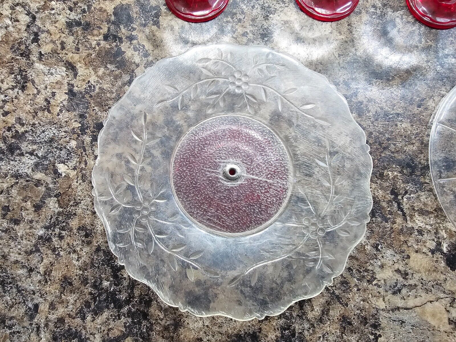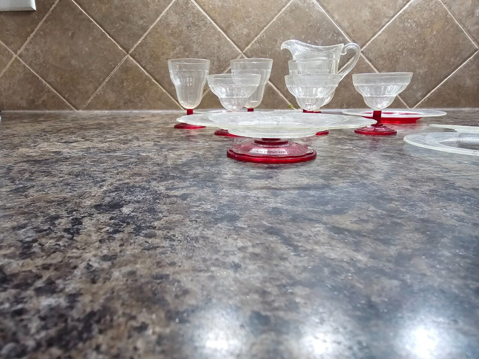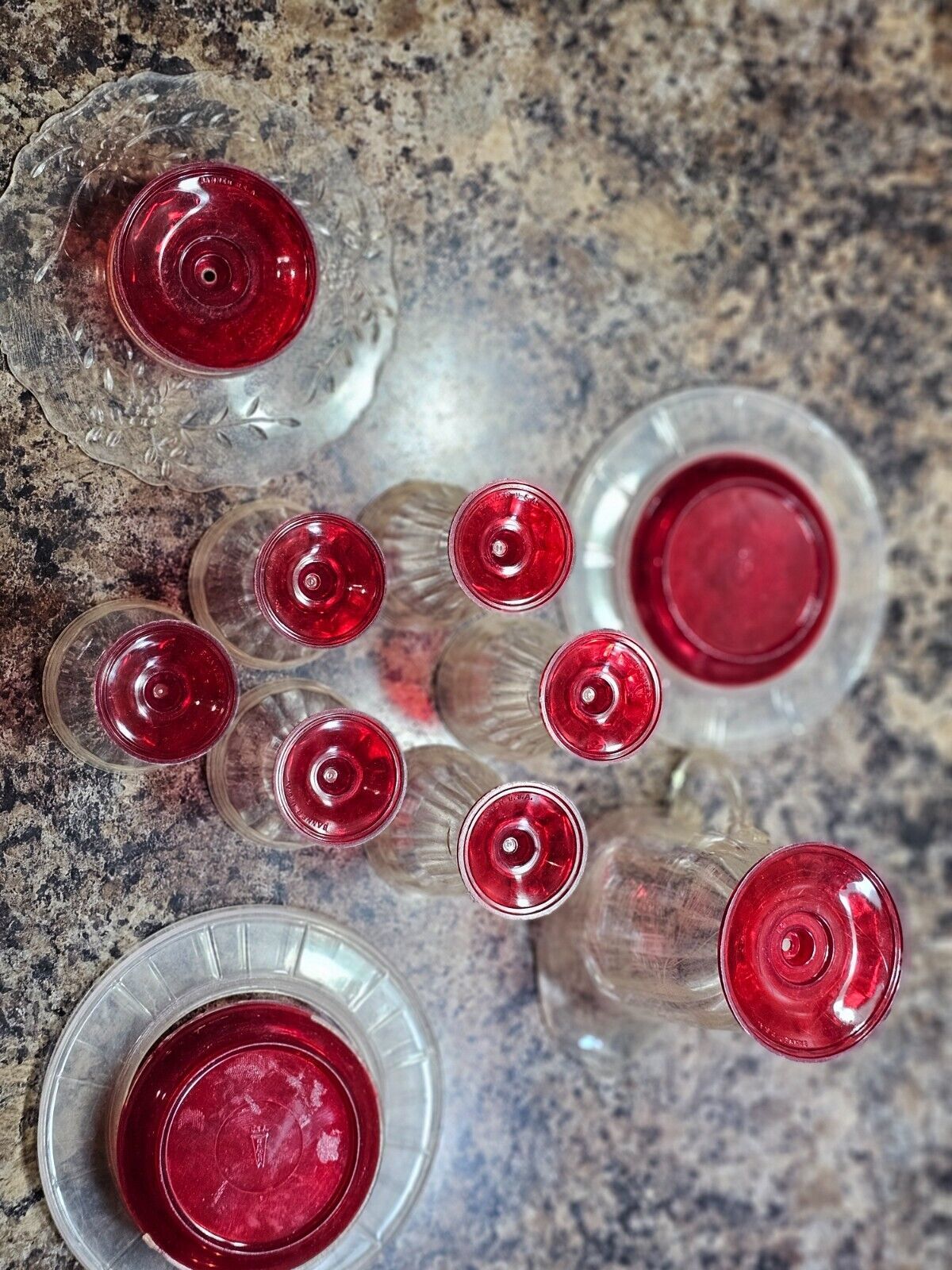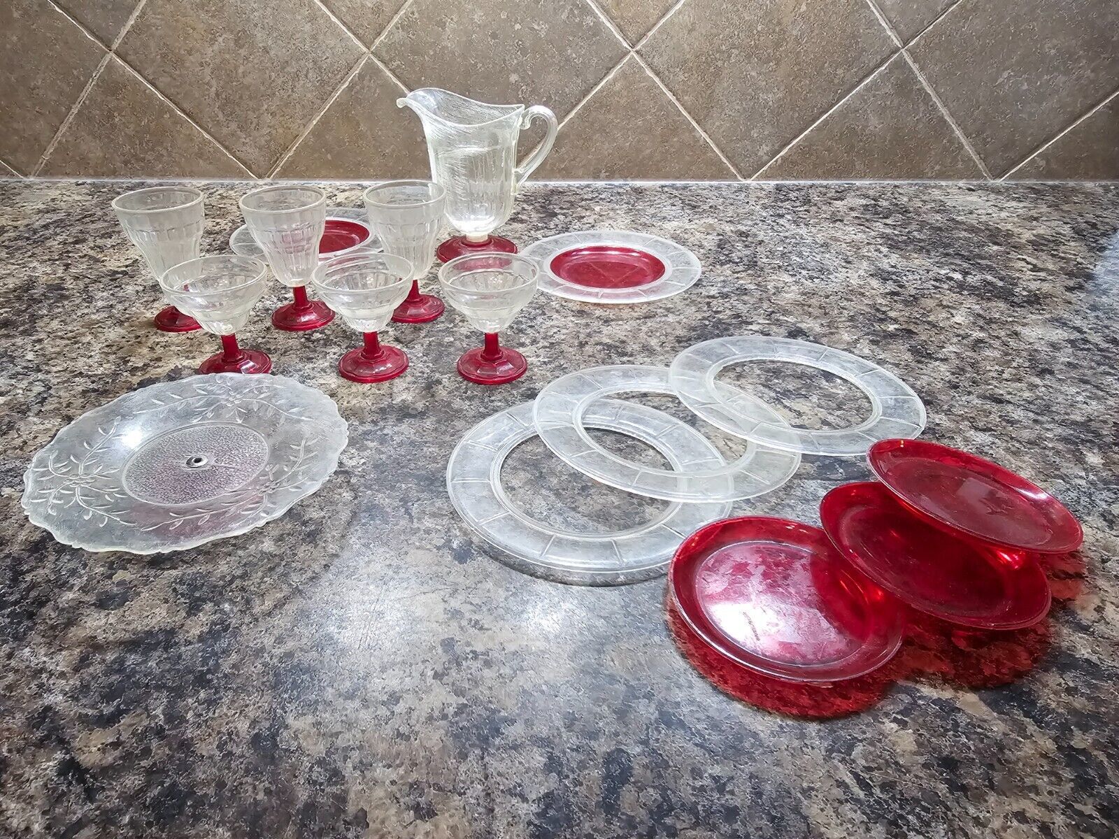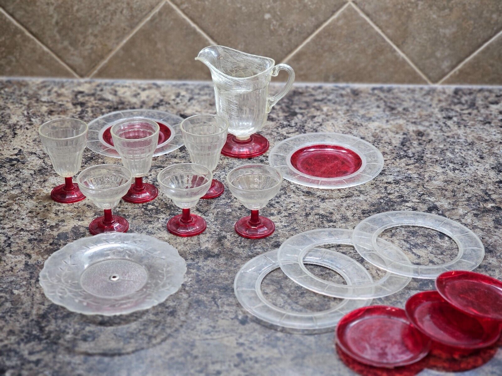 - Vtg 16pc Banner USA Child's Plastic Red & Clear Dessert Play Set Pitcher, Dishes