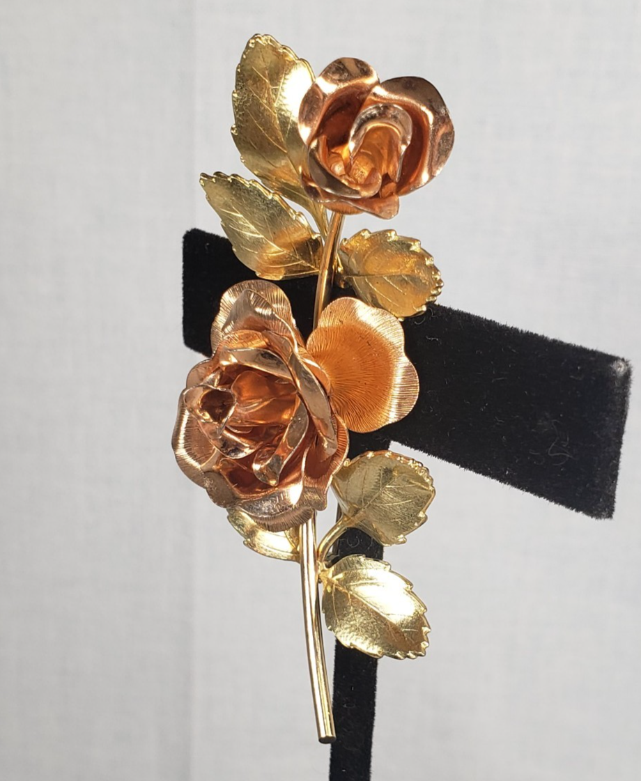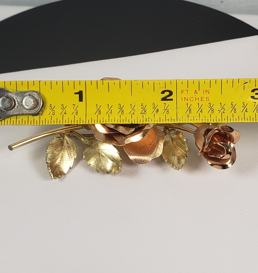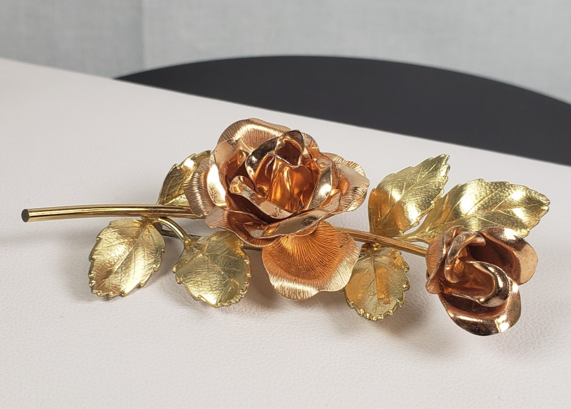Vintage 1950's Krementz Signed Two Tone Gold Filled Vermeil Rose Roses Brooch Pin 2.25" long Stamped Sterling Silver 925 1/20 12k GF Vermeil