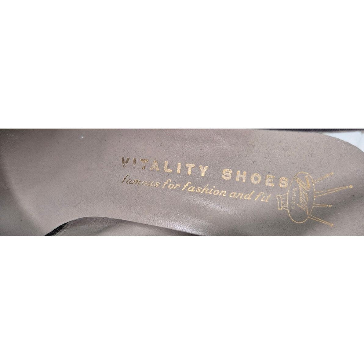 Vtg 1940s 50s Vitality Shoes Maranda Black Suede Slingback Peep-Toe Pumps Sz 8.5, leather soles( great for swing dancing!) original box. In great condition! They seem to be a true 8.5, but we can't, of course, guarantee this.