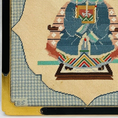 ? Vintage Chinese Chinoiserie needlepoint art featuring an emperor seated on a throne