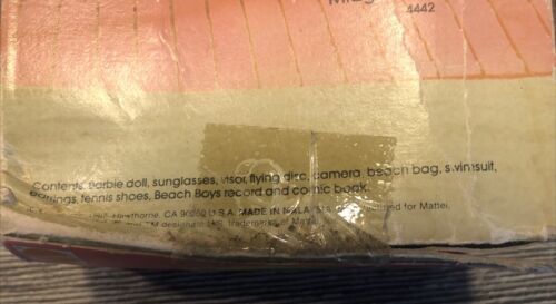Comes with accessories such as hat, brush, beach boy record toy . Original box has some signs of wear such as scratches and discolorations .Made in Malaysia .