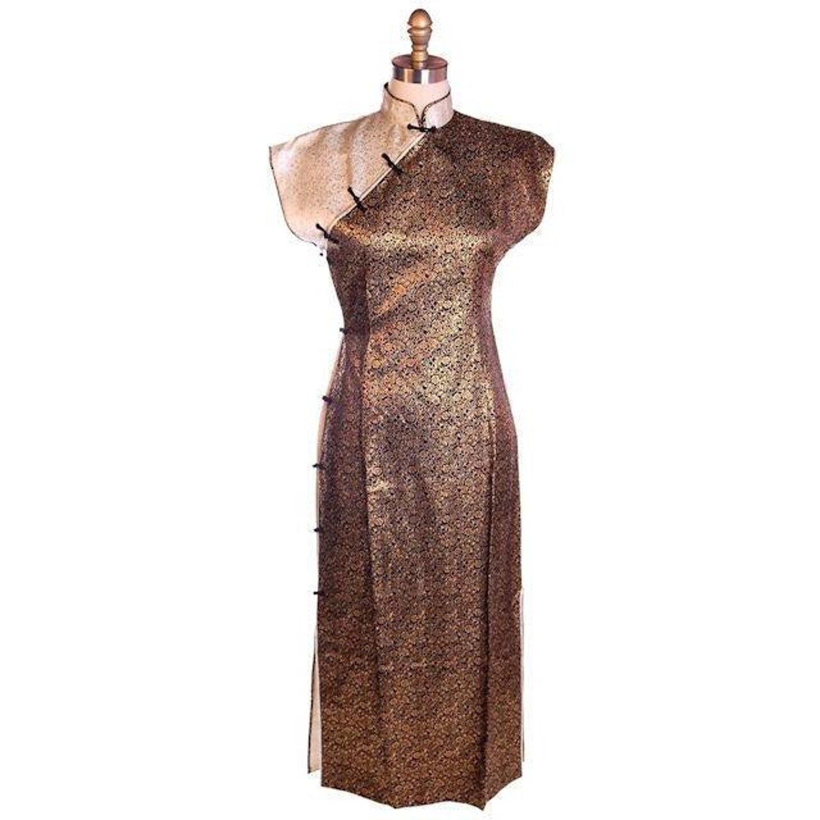 - Vtg 50s Rayon Cheongsam Qipao Wiggle Dress Gold Black Silver Brocade Fits S 2–4