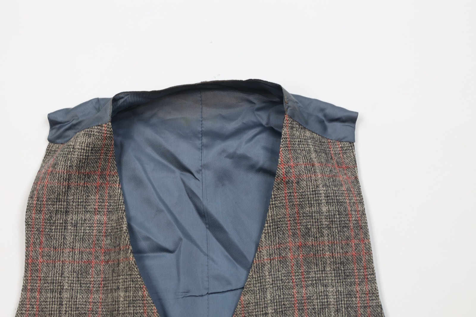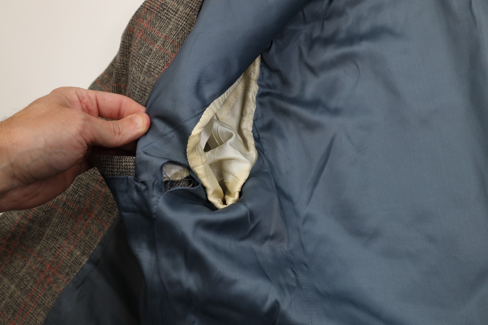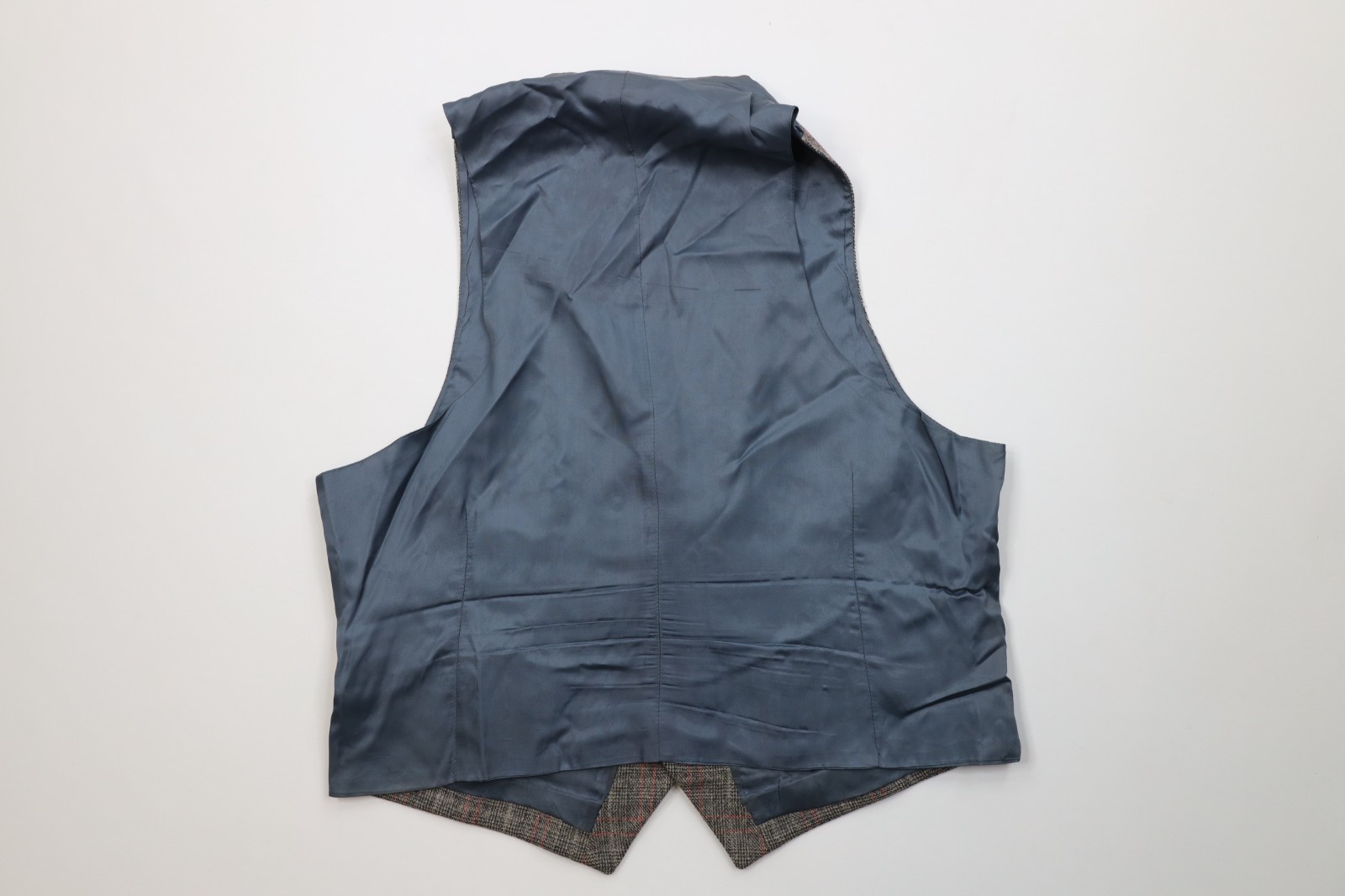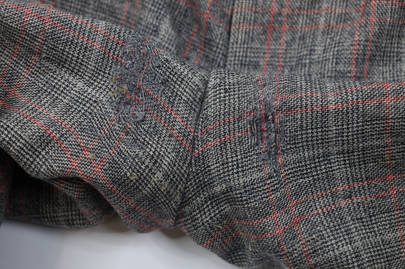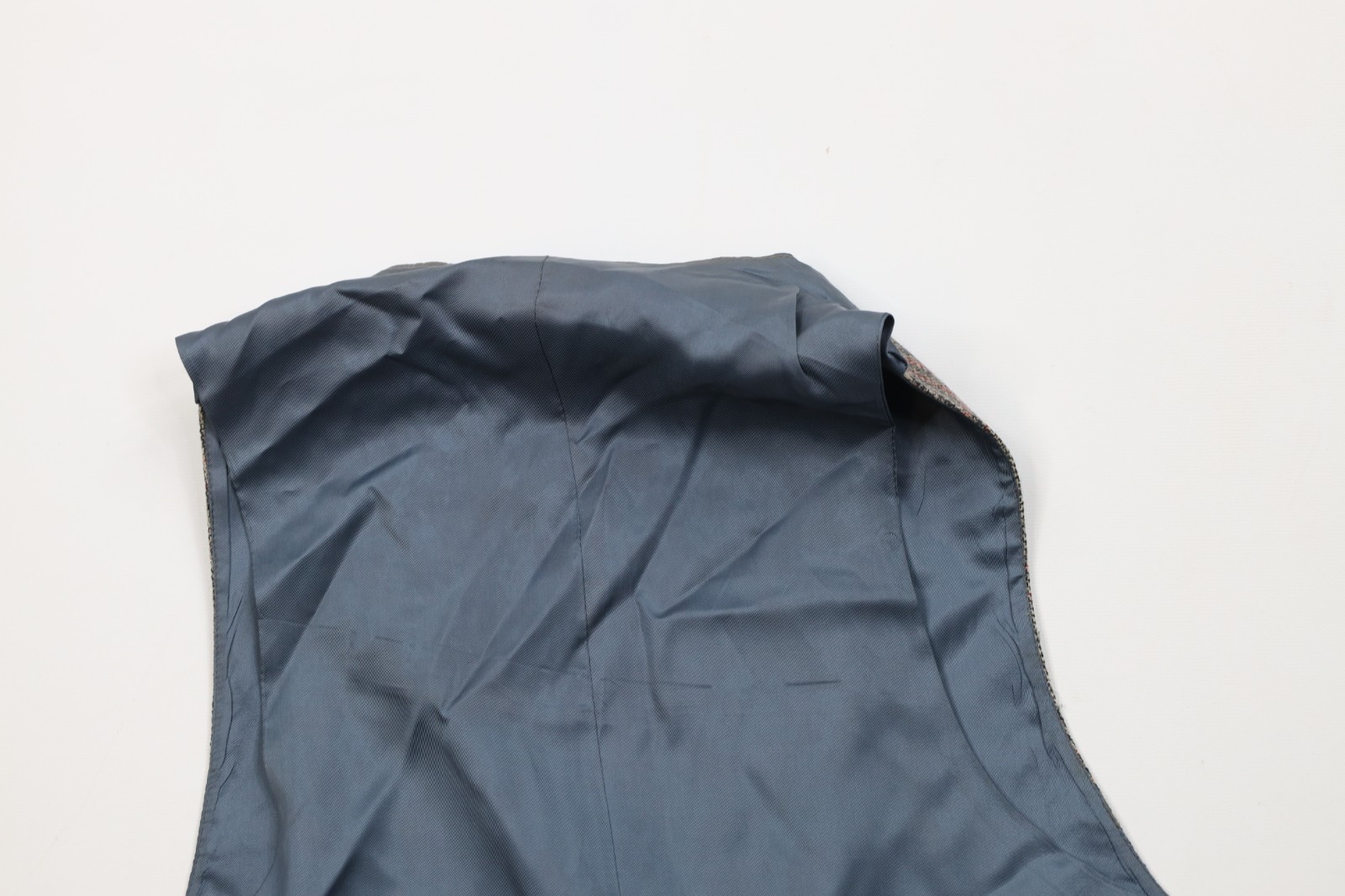 Jacket: Hole inner back liner and right armpit liner. Blemishes inside lining. Cuffs blemished. Vest: Blemishes front and back. Discolored inner lining and has blemishes. Pants: Mended patched holes inner crotch. Blemish front middle and inside
