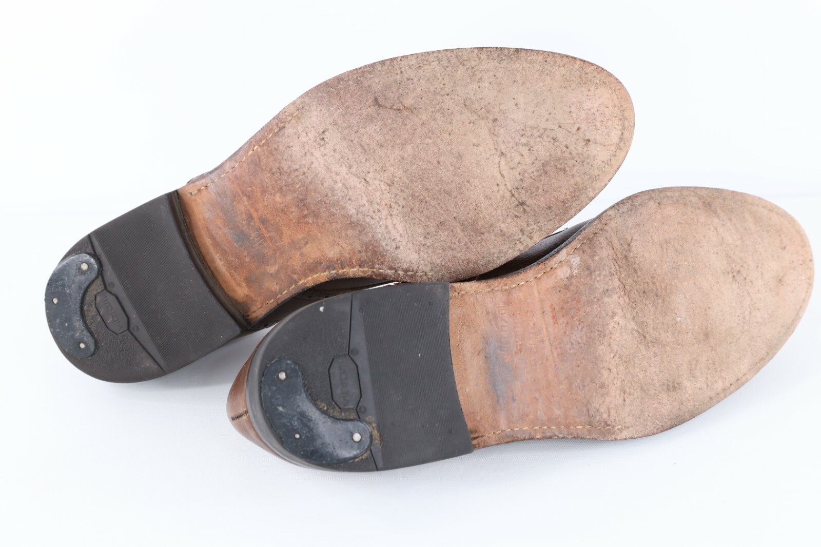 Has scuffs on toes and heels and blemishes on sides. Has fraying on right shoe seams and distressing on leather