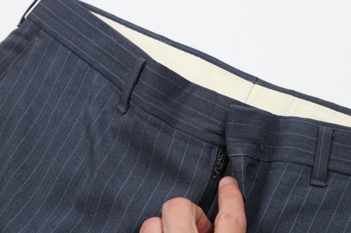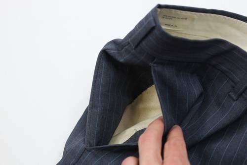 Stains front right leg, back left leg. Writing inner lining. Inner lining, cuffs discolored. Color faded. USA made