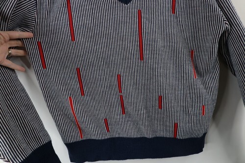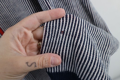 Blemish left sleeve and fabric pull. Has pilling. USA made