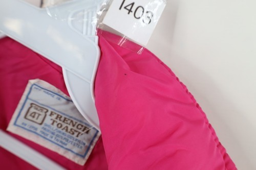 Blemishes front and on collar. Loose and missing threads. Loop mended near tag.
