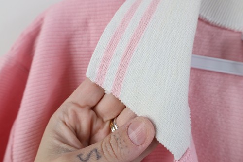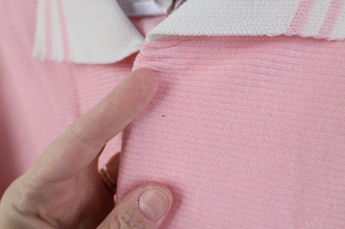 Hole front top. Collar yellowed, has fabric pulls. Color faded. Pilling. Loose threads tag. Made in USA