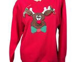 - Vtg 80s Christmas Sweatshirt Red Reindeer Applique Rudolph Bells Size M Tultex