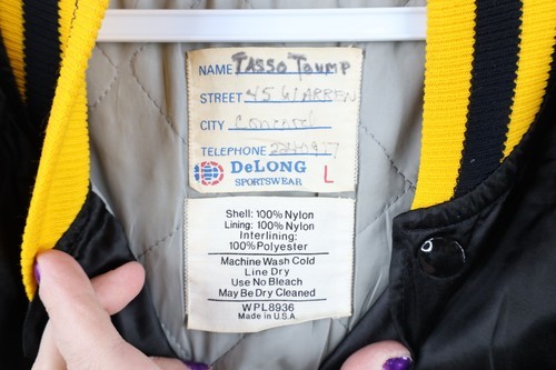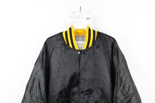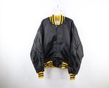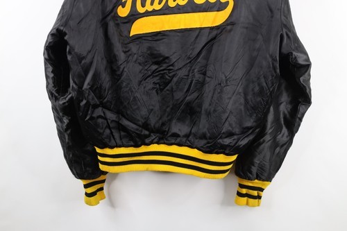 - Vtg 80s Mens Large Distressed Spell Out Harvest Satin Bomber Jacket Black USA