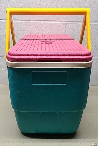 This vintage Igloo cooler is a must-have for any retro lover! With its eye-catching neon pink, teal, yellow, and white pattern, it's sure to be the talk of your next outdoor gathering. The cooler, also known as The Picnic Basket, was manufactured in 1991 in the United States and is made of durable plastic.