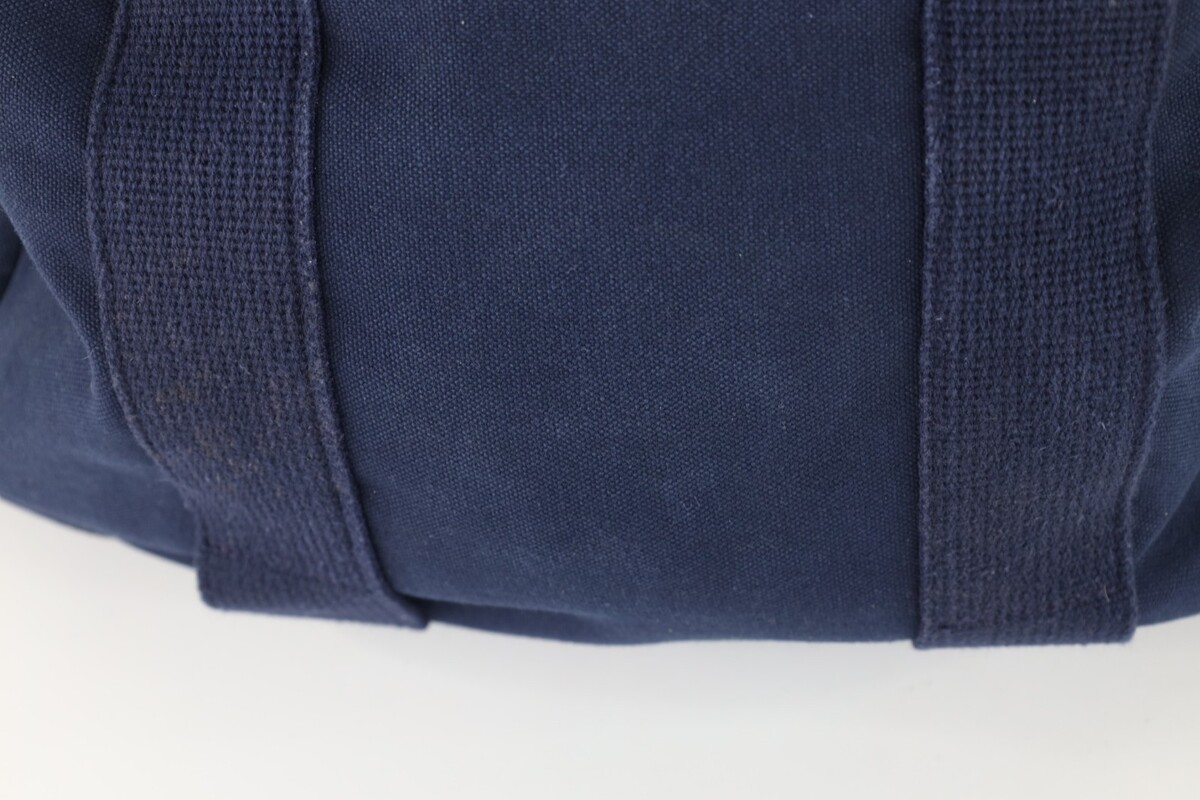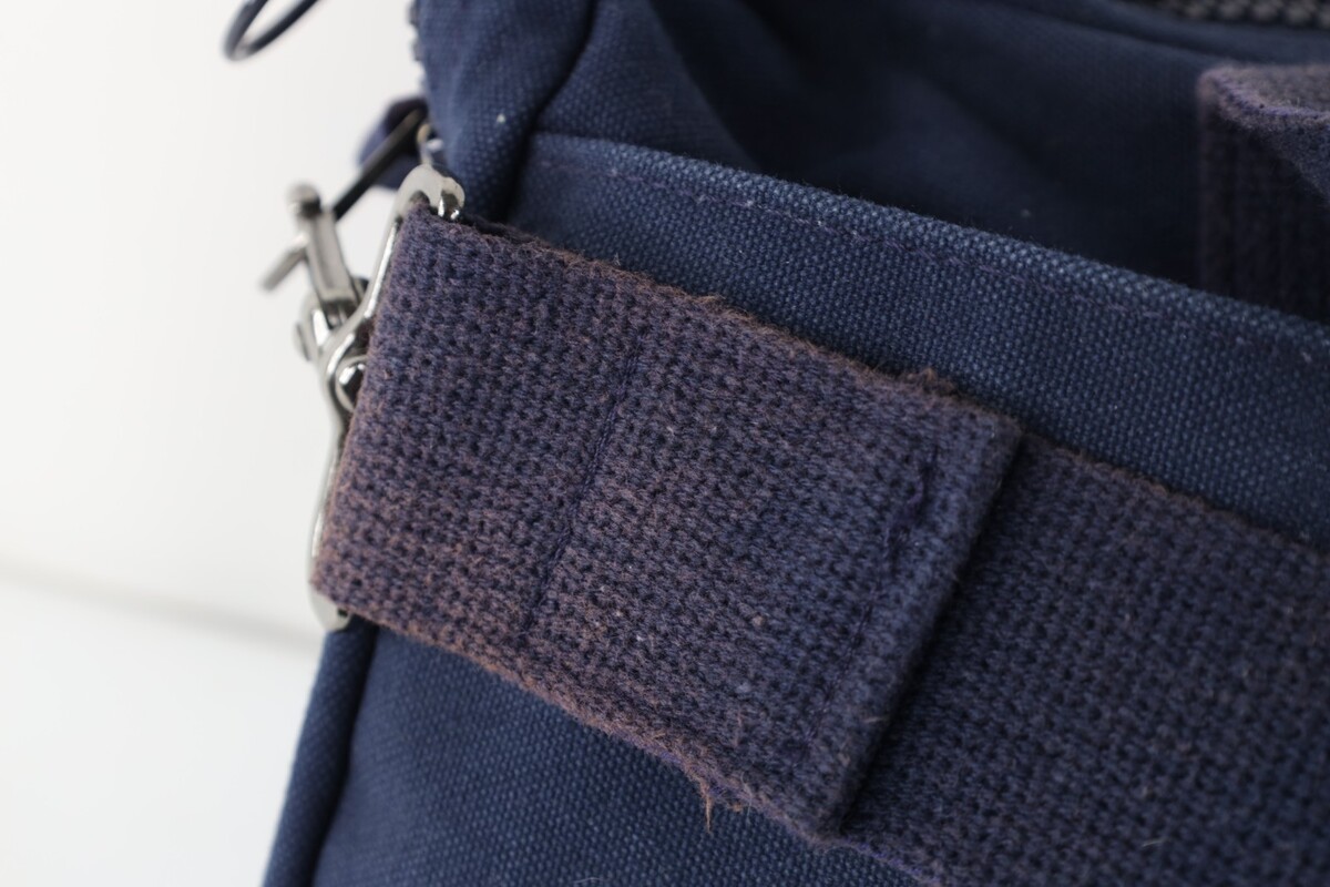 Fray spot on back corner. Has company logo on one side. Blemishes outside and inside. Has color fade. Discoloring on strap. USA made