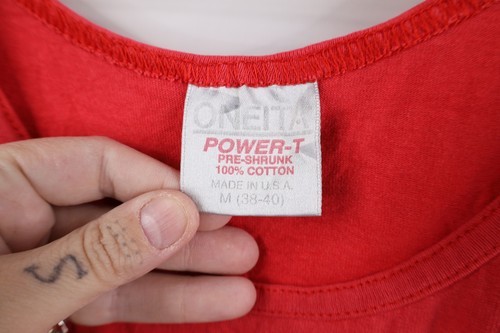 Holes front. Stains back. Dark spots/blemishes front, back. Collar, armpits discolored. Graphics cracking, color faded. Pilling. Made in USA