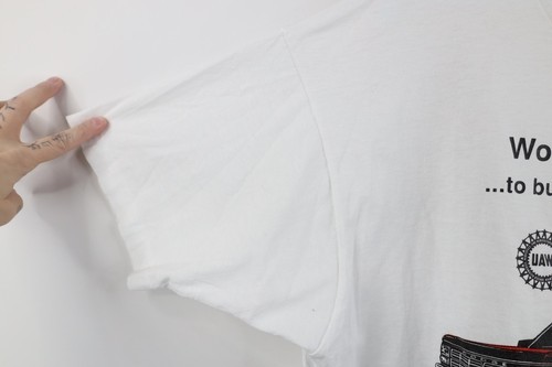 Blemishes right armpit. Collar, armpits discolored. Yellowed. Graphics faded. Pilling. Made in USA