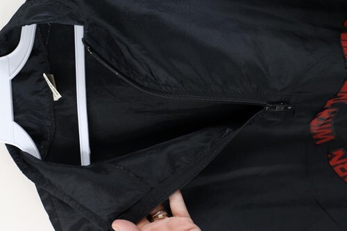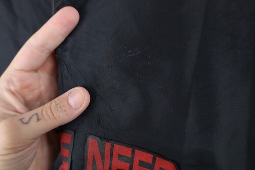 Blemishes throughout. Graphics peeling/faded. Loose threads collar, bottom hem. Collar, cuffs discolored. Color faded. Made in USA