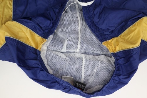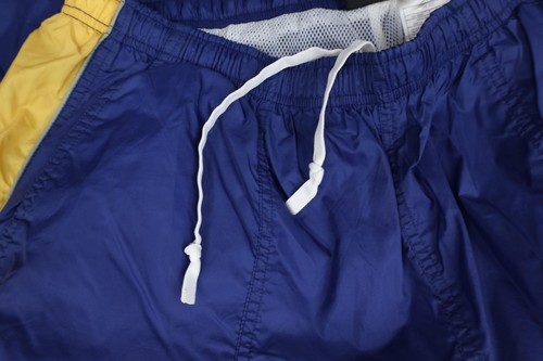 Blemishes throughout. Logos distressed. Inner lining, cuffs discolored. Color faded. Waist stretched. String distressed