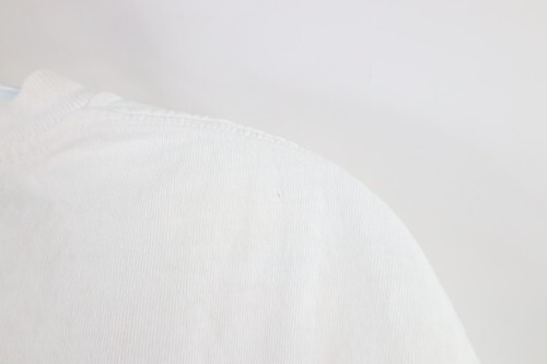 Blemishes front, right sleeve. Holes back bottom, left sleeve. USA made
