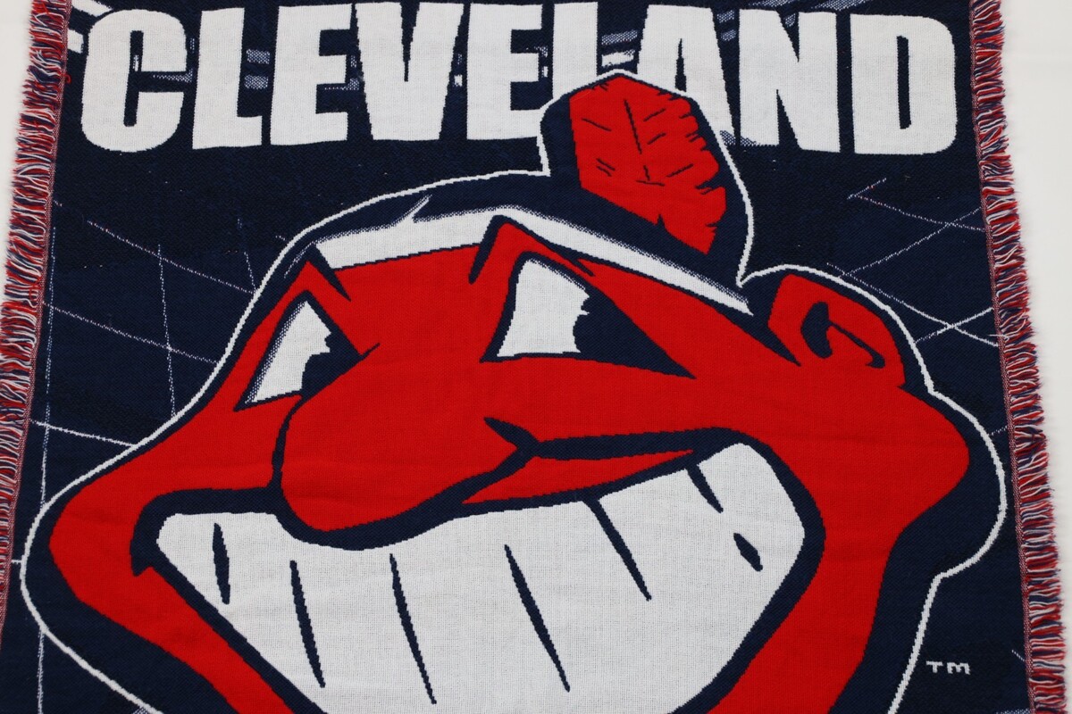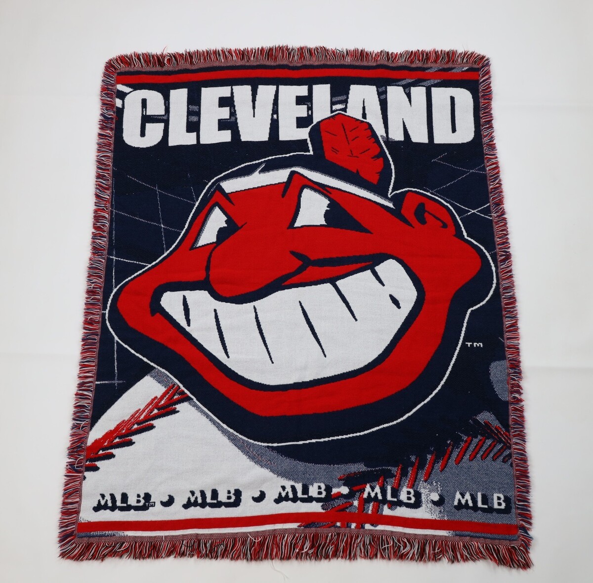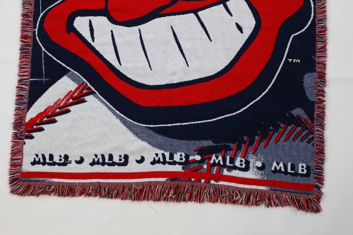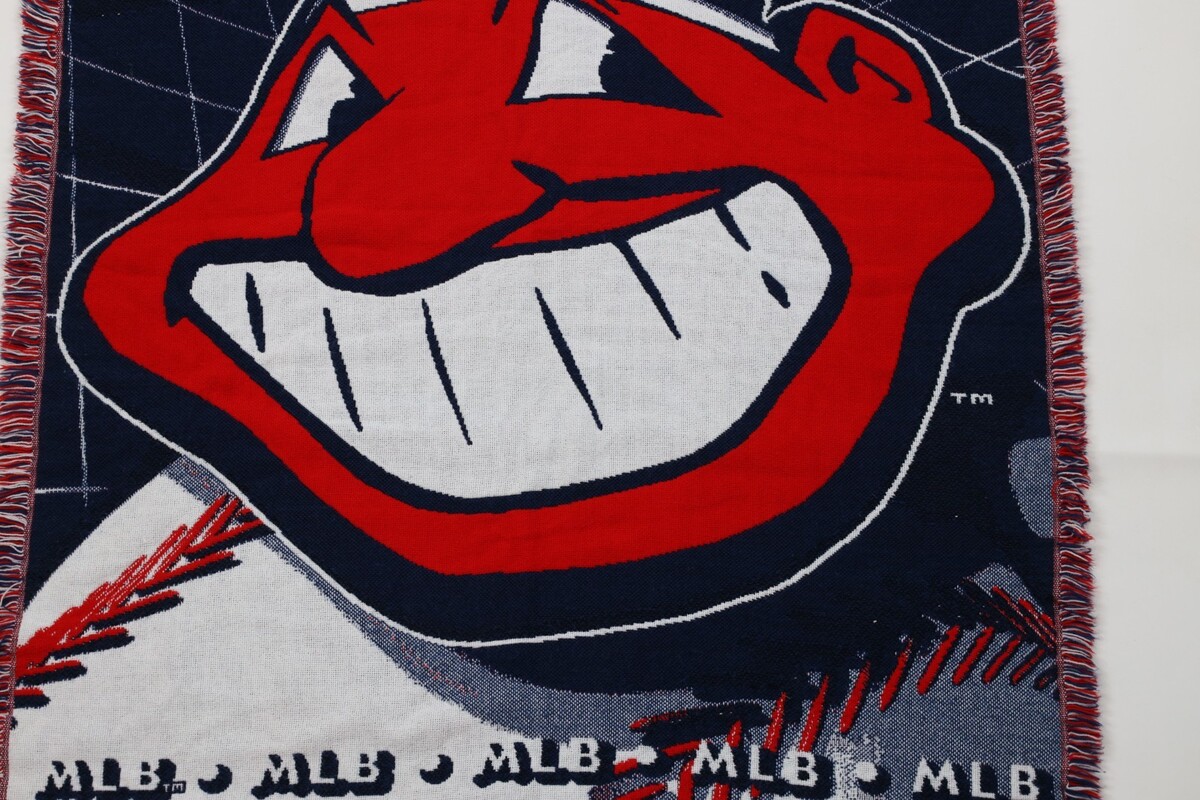 - Vtg 90s Spell Out Chief Wahoo Cleveland Indians Baseball Fringed Blanket 44"x55"