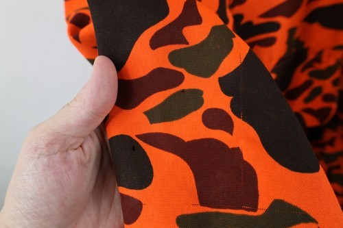 Blemishes and fabric pulls throughout. Holes right sleeve, back middle on flap. USA made