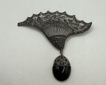 - Vtg 925 Sterling Silver Hinged Black Onyx Marcasite Filigree Fan Pin Brooch 19g