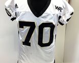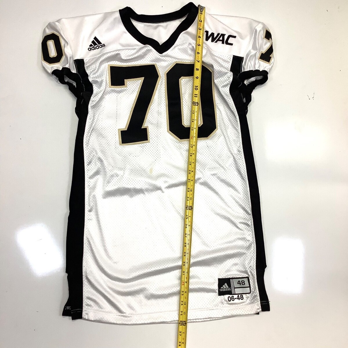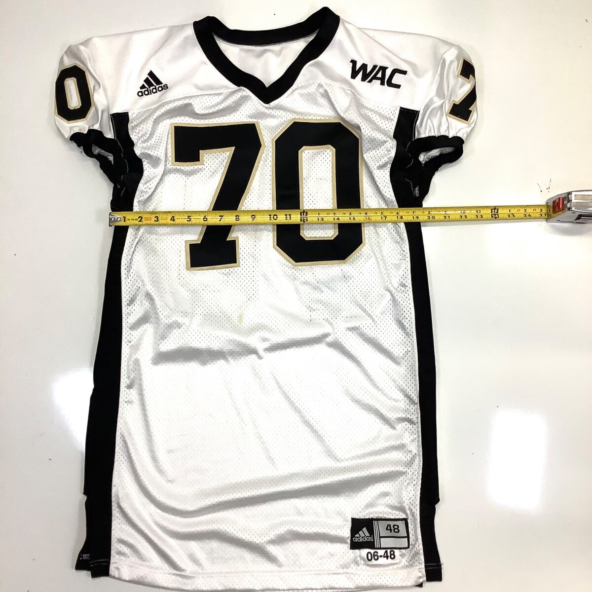 Vtg Adidas #70 White WAC Football Practice Jersey Men?s 48 Sz XL Idaho. Really nice WAC practice football jersey size 48 or extra large. White with black and light tan embroidered numbers. I believe this. May the Idaho Vandals colors. Overall good condition. Does have a few small spots that I did not try to wash out. Please see all photos. Photos include measurements for armpit to armpit and four top of shoulder to bottom of jersey.