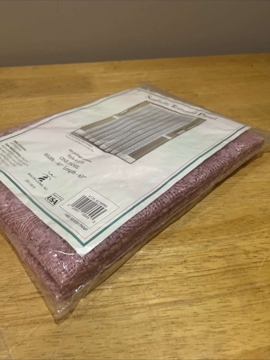 This vintage Beacon Looms window lace panel curtain features a pink seashells style design, measuring 40x63 inches. Made in the USA in the 1980s, this sheer polyester curtain has a textured pattern and rod pocket heading. It is machine washable and suitable for any room in the house. This unique and retro piece would make a charming addition to any decor, whether for teens, adults, or unisex kids.