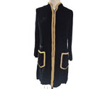 Vtg Black Velvet Dress Coat Gold Trim Pockets Zipper down front 60s 70s Women L