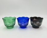 - Vtg Bohemian Colored Crystal Cut Scalloped Edge Votive Green Blue Purple 3 Pcs