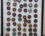 - Vtg Bottle Cap Display of 60 - Pepsi Whistle Bubble Up ChocOla Coca-Cola Etc.