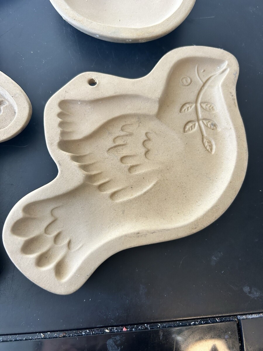 The Vtg Brown Bag Cookie Art Molds Xmas Lot of 4 are a set of four holiday-themed cookie molds, featuring designs of a dove, gingerbread man, rocking horse, and snowman. Made of stoneware in a medium size, these original 1984-1993 vintage molds from the Brown Bag Cookie Art brand are perfect for creating festive Christmas cookies. The set includes molds and cutters for candy, chocolate, and flour-based treats, adding a touch of nostalgia to your holiday baking. Made in the United States, these brown-colored molds are a must-have for any collector or baking enthusiast.