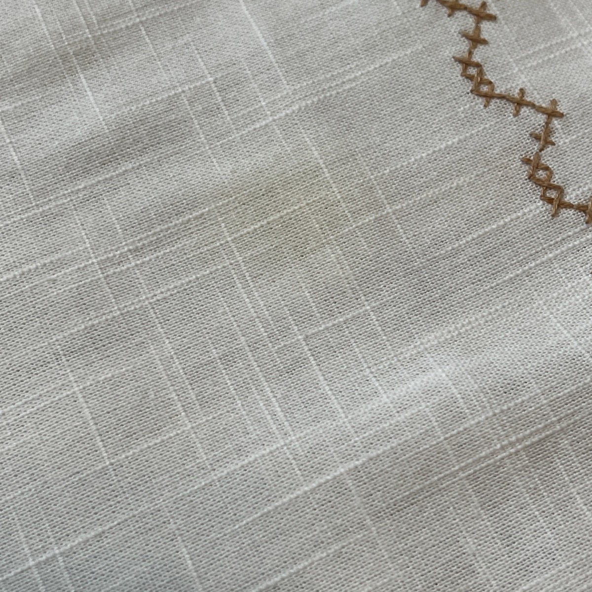 This is preowned. It was used, but is in excellent condition. There are some very light spots on the tablecloth. See pictures. There are no rips holes or tears.