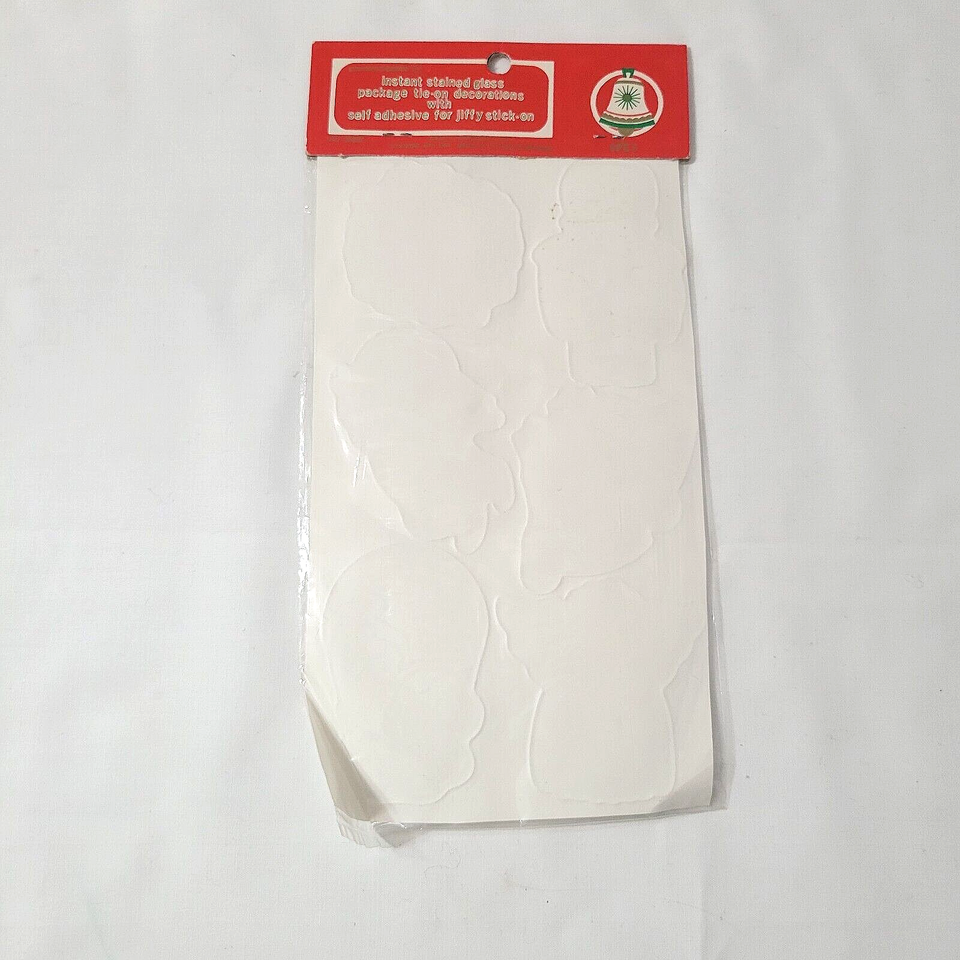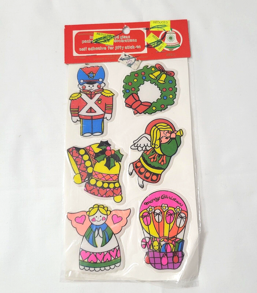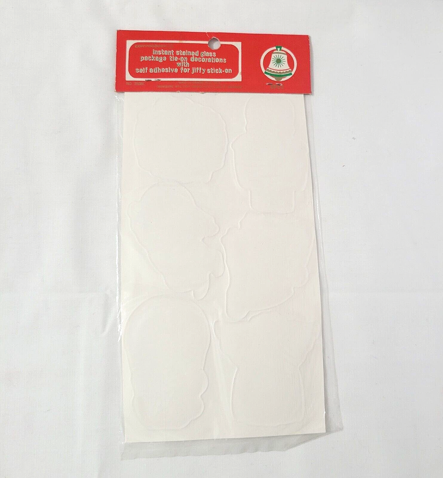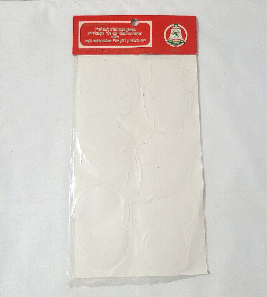 All brightly colored, package states "instant stained glass package tie-on decorations with self adhesive for jiffy stick-on"