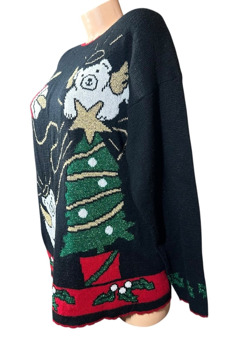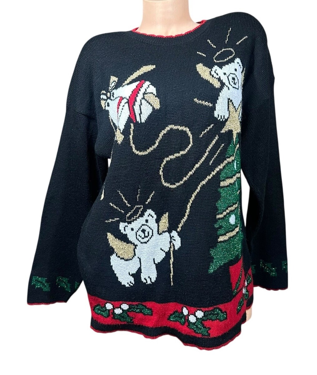 - Vtg Christmas Sweater Angel Polar Bears Tree Black Soft JJ Poole Not Ugly Size L