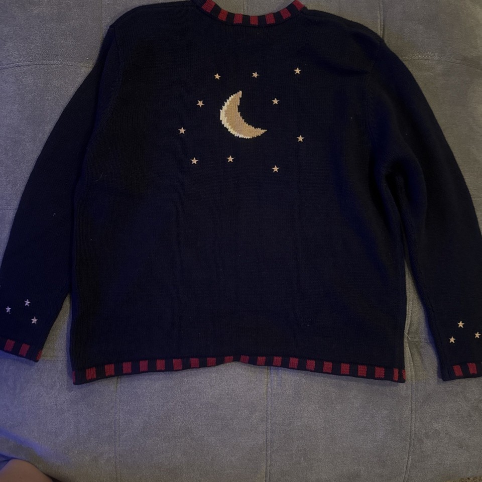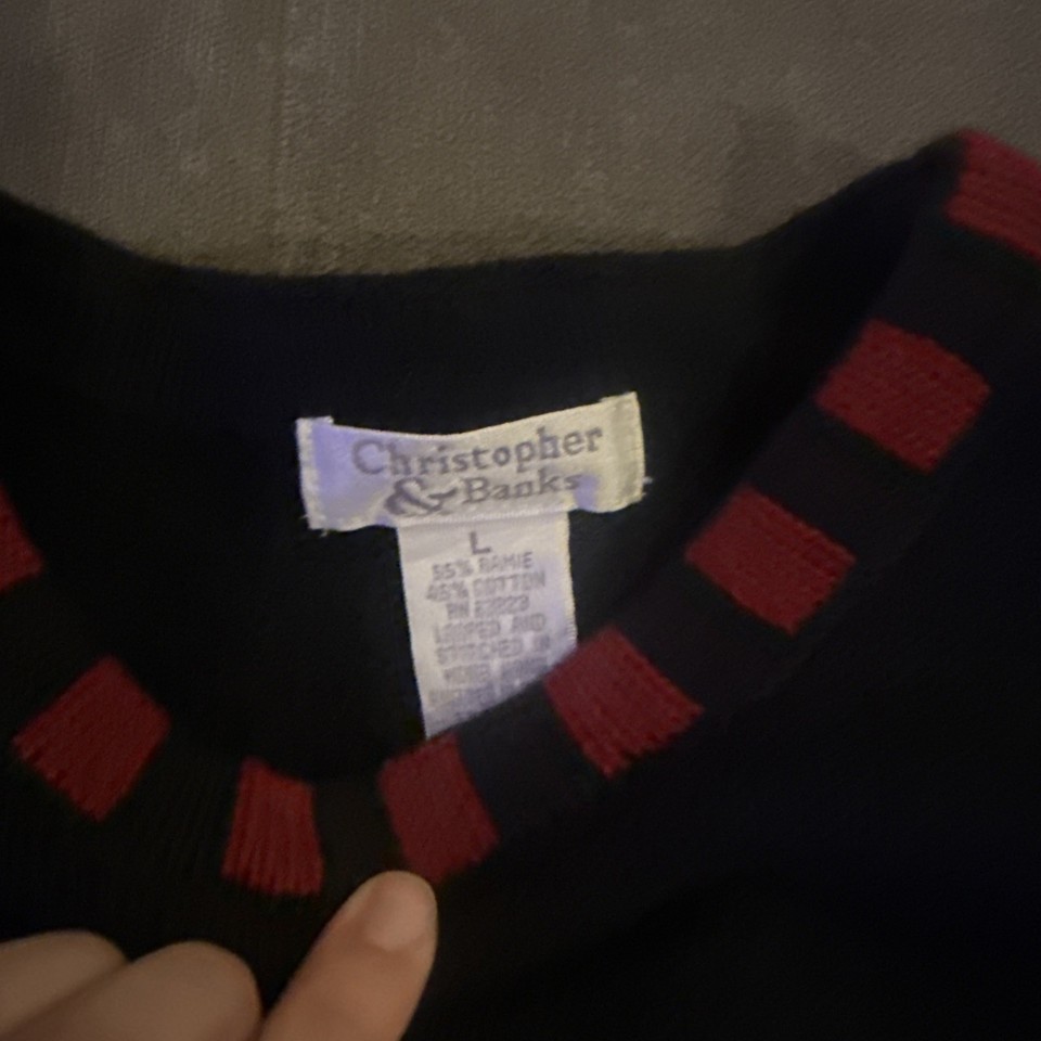 This vintage Christopher Banks sweater in size Lg features intricate hand-embroidered Christmas themes of Santa Claus and reindeers on a tight-knit blue fabric. With a crew neck and long sleeves, this pullover sweater is perfect for the winter season and holiday parties. Made from a blend of ramie and cotton, this sweater is both comfortable and breathable, making it a classic and festive addition to any woman's wardrobe.