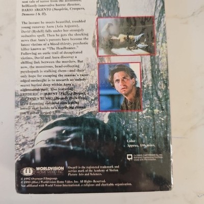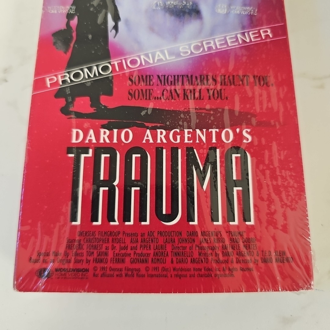 The product is a vintage VHS tape of Dario Argento's "Trauma" from 1992, featuring a blend of horror, thriller, slasher, cult, and gore sub-genres. Directed by Dario Argento, the film stars Christopher Rydell, Asia Argento, and Piper Laurie, with Brad Dourif also in a prominent role. This new, sealed VHS tape has an NTSC signal standard and is rated R for its content. Produced by Overseas Film Group Worldvision in the United States, this full-screen edition is in English and sure to appeal to fans of classic horror films.