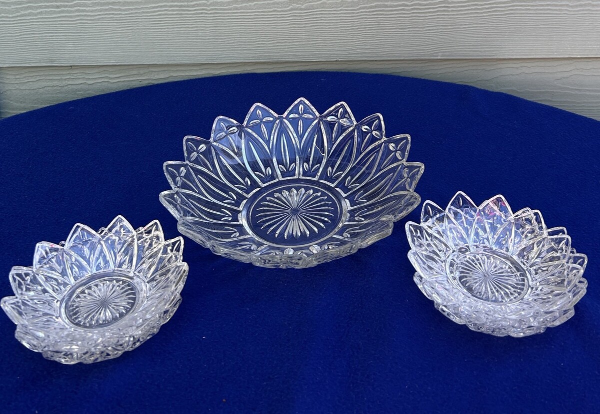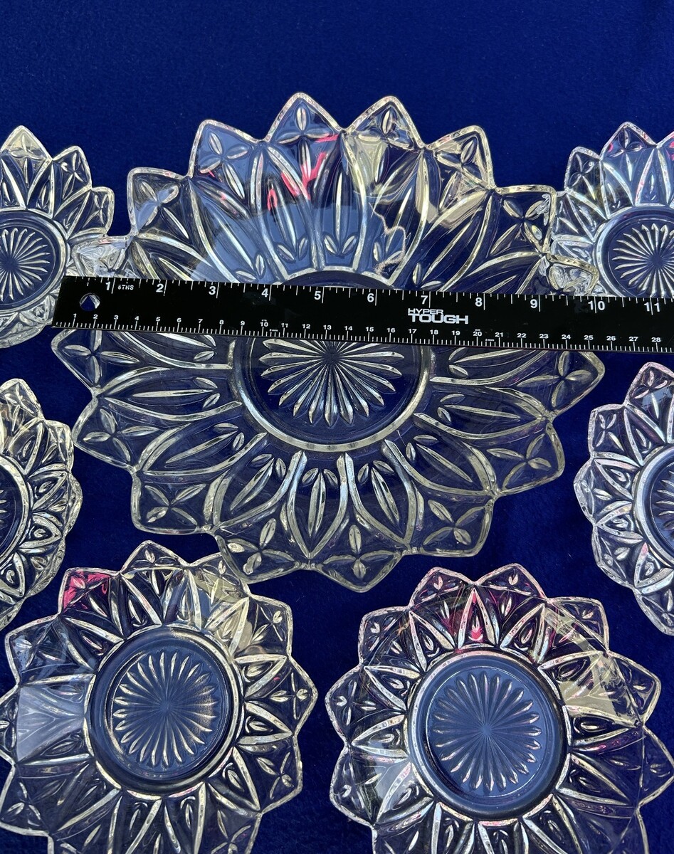 Large set of Federal Glass clear petal bowls, including the 10 1/8" 16 point dessert bowl and six 5 1/2" 12 point berry bowls. No chips, scratches or sickness. See my other items in this pattern.