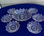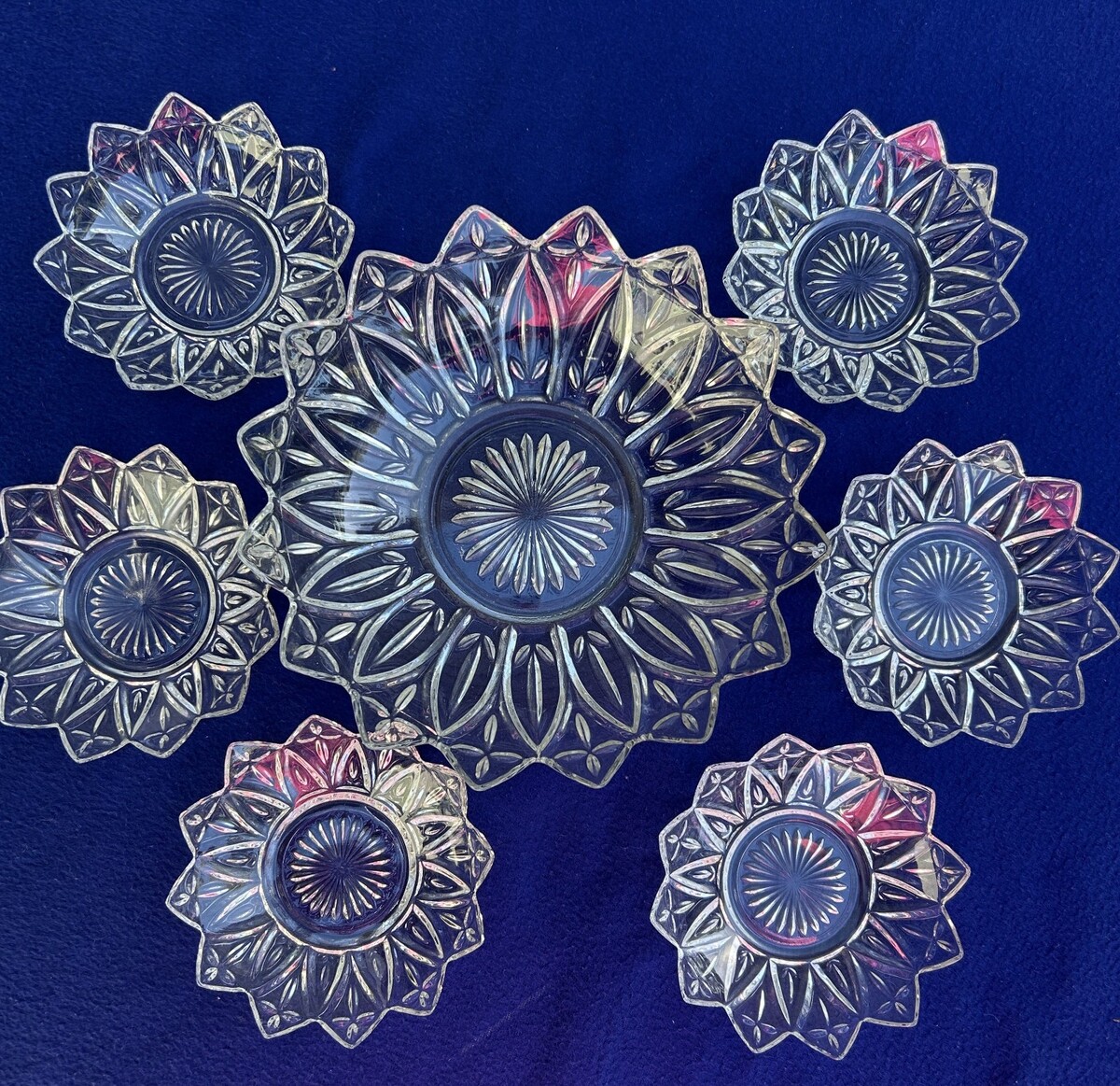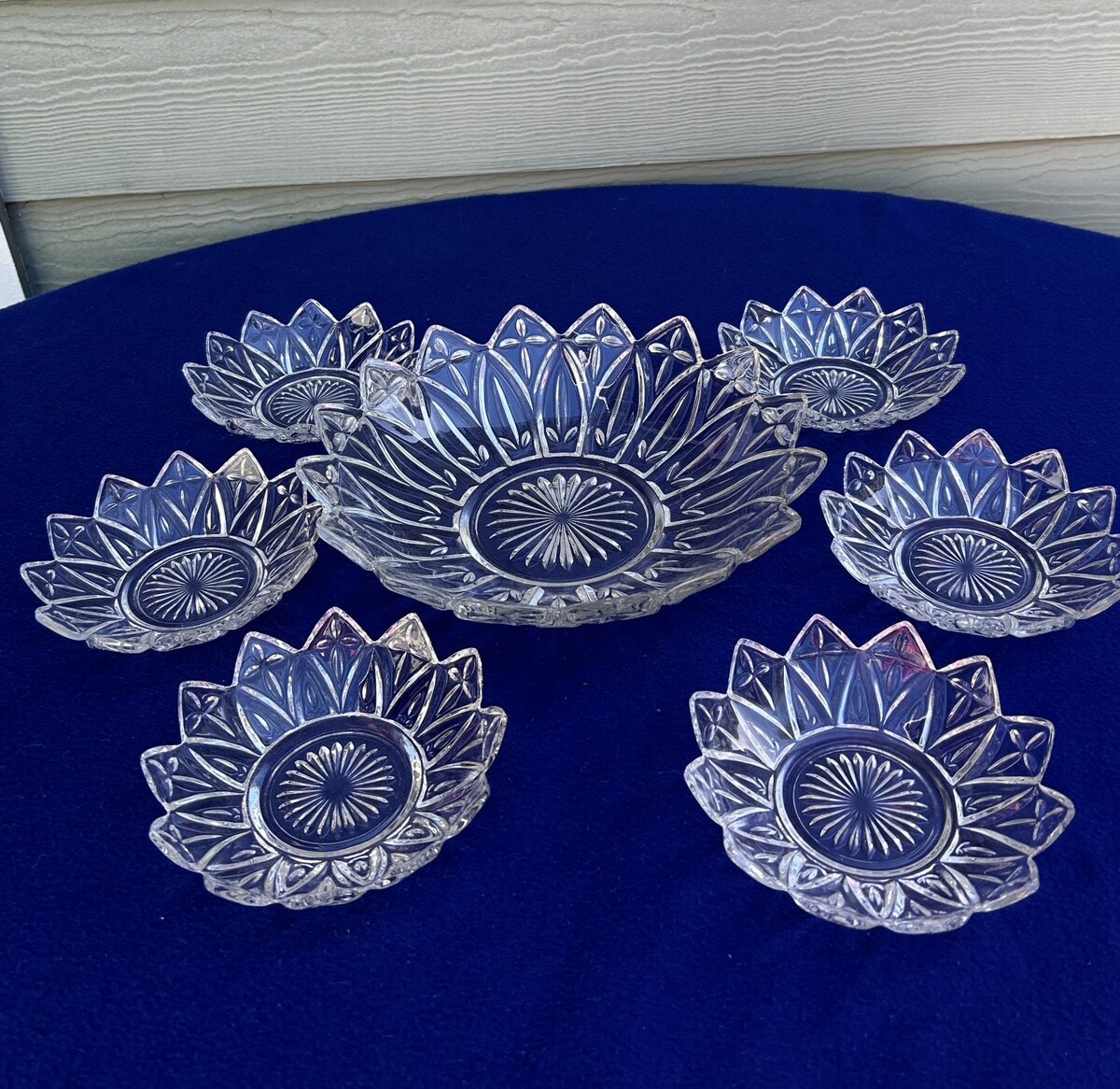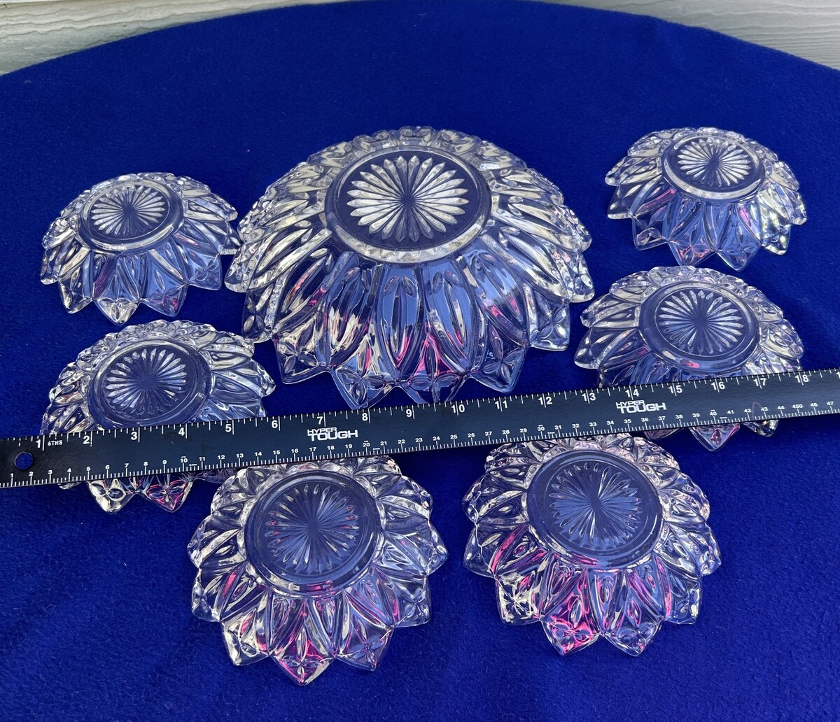 - Vtg Federal Glass Petal clear set 10" large bowl & 6 small berry bowl salad set