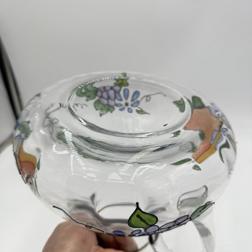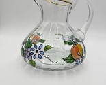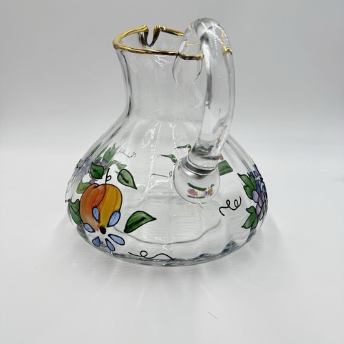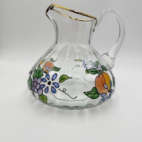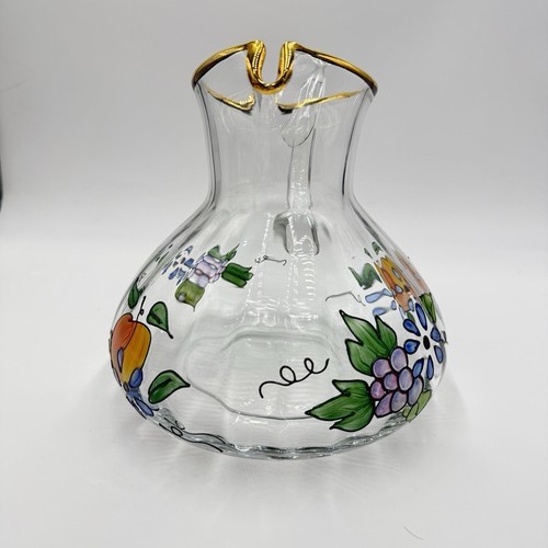 This vintage Fifth Ave Crystal Ltd. pitcher from Romania features hand-painted fruit design in 22k gold on round, glossy glass. It is a large, hand-blown piece with a gold color and requires hand wash only. The pitcher is unboxed and showcases a theme of fruit and flowers, making it a decorative and unique addition to any collection.