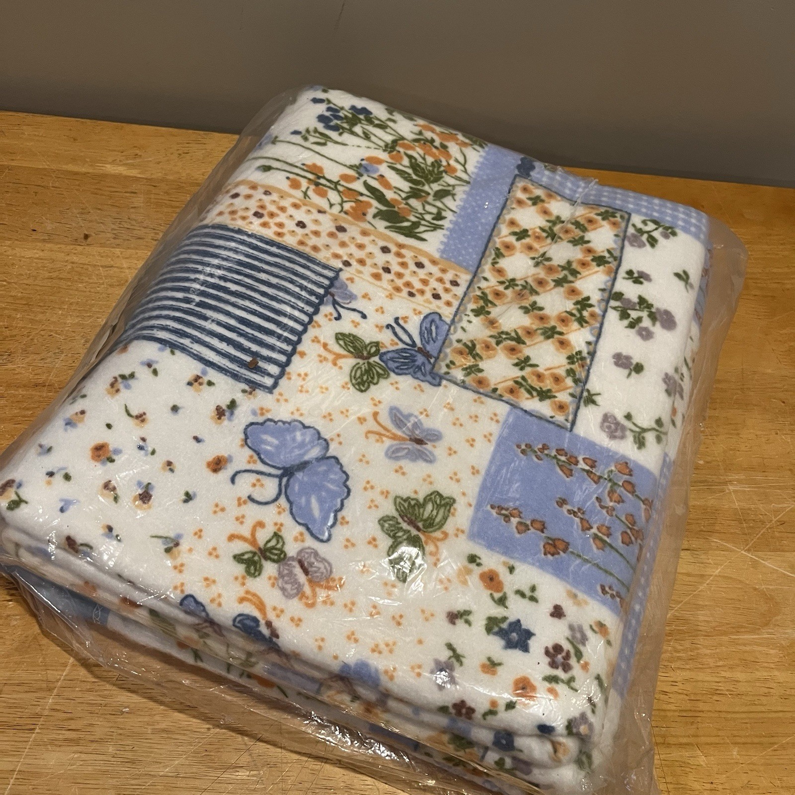 - Vtg Floral Blue Butterfly Bird Satin Trim Blanket 72x90 MCM Patchwork Cottage