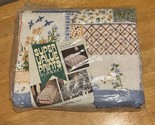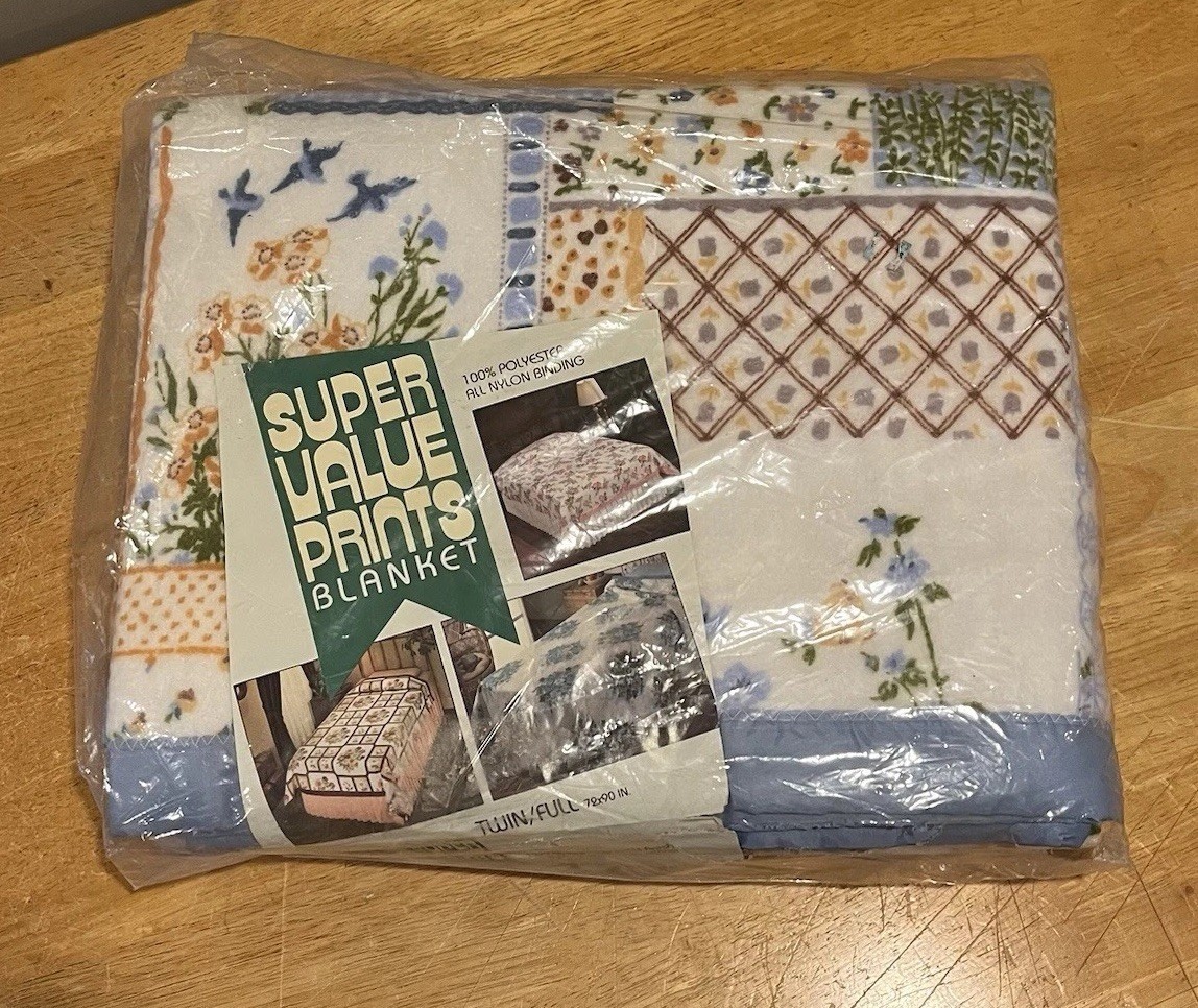 Vtg Floral Blue Butterfly Bird Satin Trim Blanket 72x90 MCM Patchwork Cottage