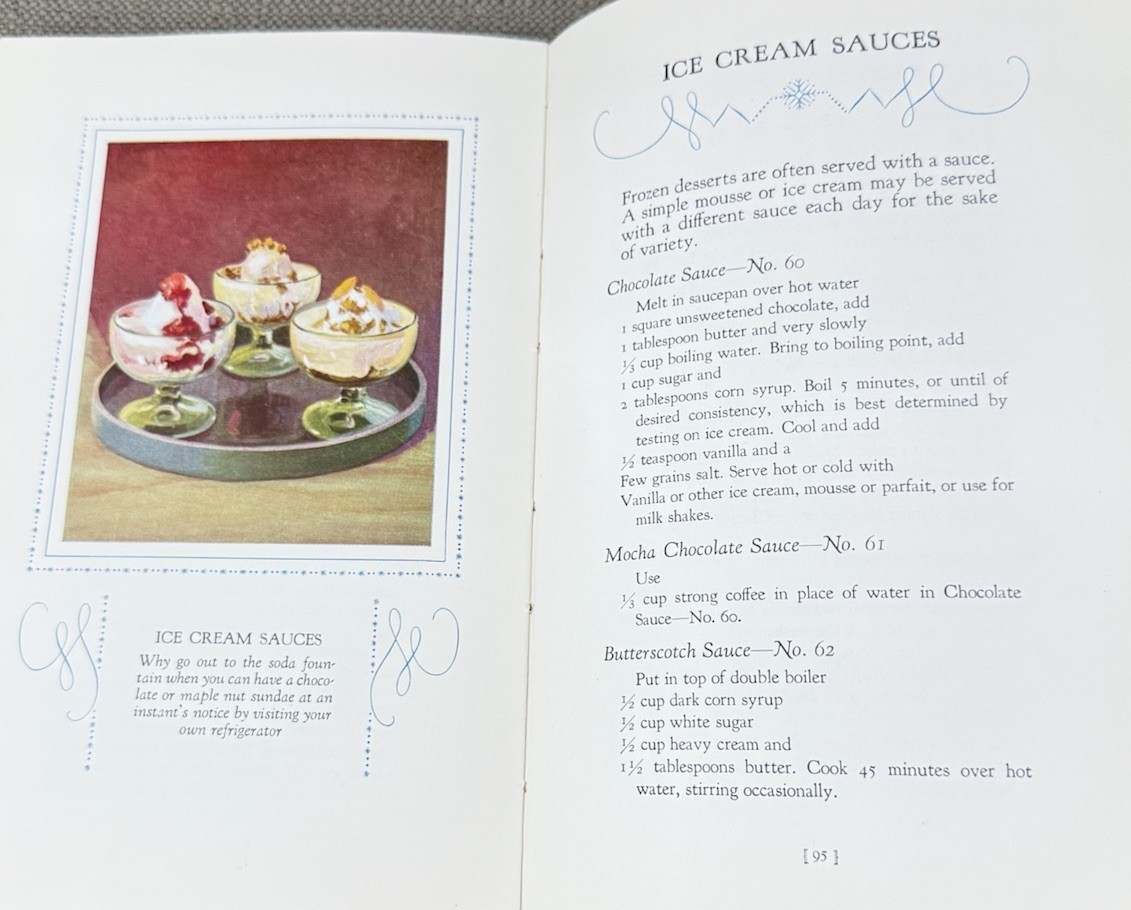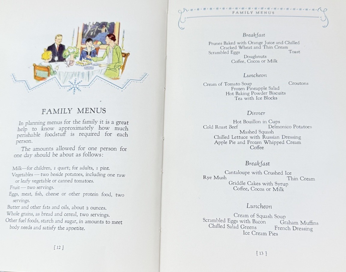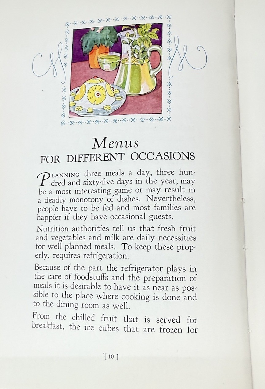 This fifth edition features Art Deco styling, color illustrations, and recipes tailored for the ?modern homemaker.? Includes menus for various occasions, tips on meal planning, and insights into early refrigeration?s impact on cooking.