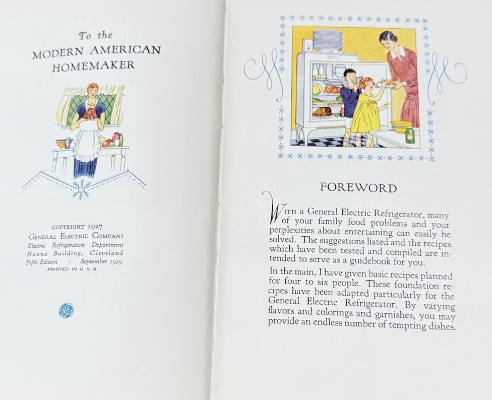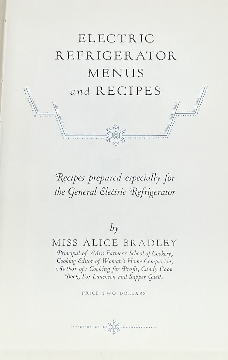 Charming 1929 hardcover cookbook titled Electric Refrigerator Recipes and Menus, prepared especially for the General Electric Refrigerator by Miss Alice Bradley, Principal of Miss Farmer?s School of Cookery and Cooking Editor of Woman?s Home Companion. Published by the General Electric Company, Cleveland.
